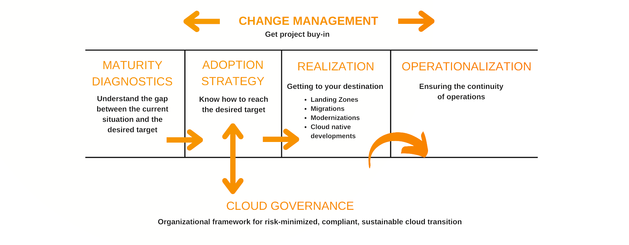 Cloud migration projects can be complex without rigorous assessment, planned change management and meticulous execution. Attention to detail is required at all times. This is why our cloud migration experts are with you every step of the way, following our “Flight Plan,” our own methodology or that of our partners (AWS and Microsoft Cloud Adoption Framework).