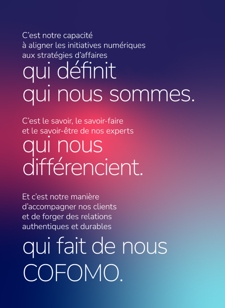Elle est le fruit d’un parcours, d’une maturité et d’une volonté claire de mieux exprimer ce que COFOMO est devenue au fil des années. Une organisation qui a évolué, tout comme les enjeux de ses clients, la complexité des transformations et les attentes envers un partenaire de confiance.